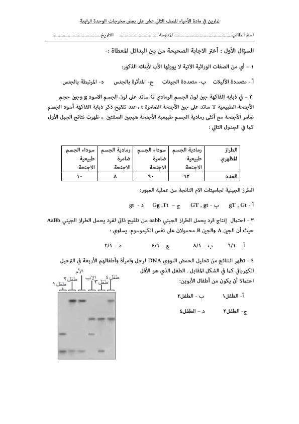 تمارين مراجعة في الاحياء للصف الثاني عشر الفصل الثاني