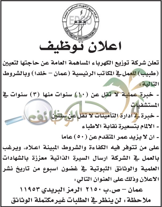 تعلن شركة توزيع الكهرباء المساهمة العامة عن حاجتها الى الوظائف التالية